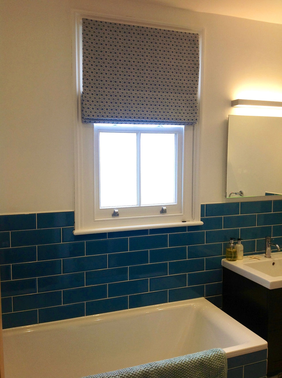 A roman blind for a bathroom. Made up in the Jane Churchill fabric, Cornelia (blue). Preshrunk lining and fibreglass components were used to avoid moisture damage as much as possible.